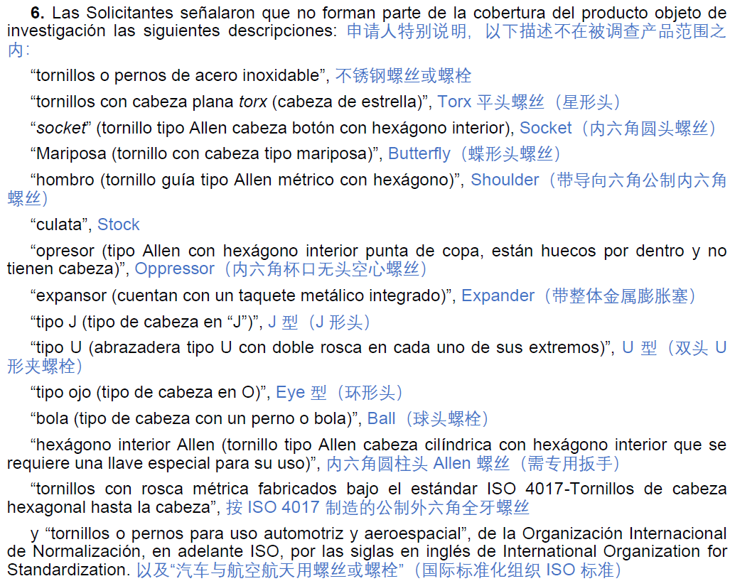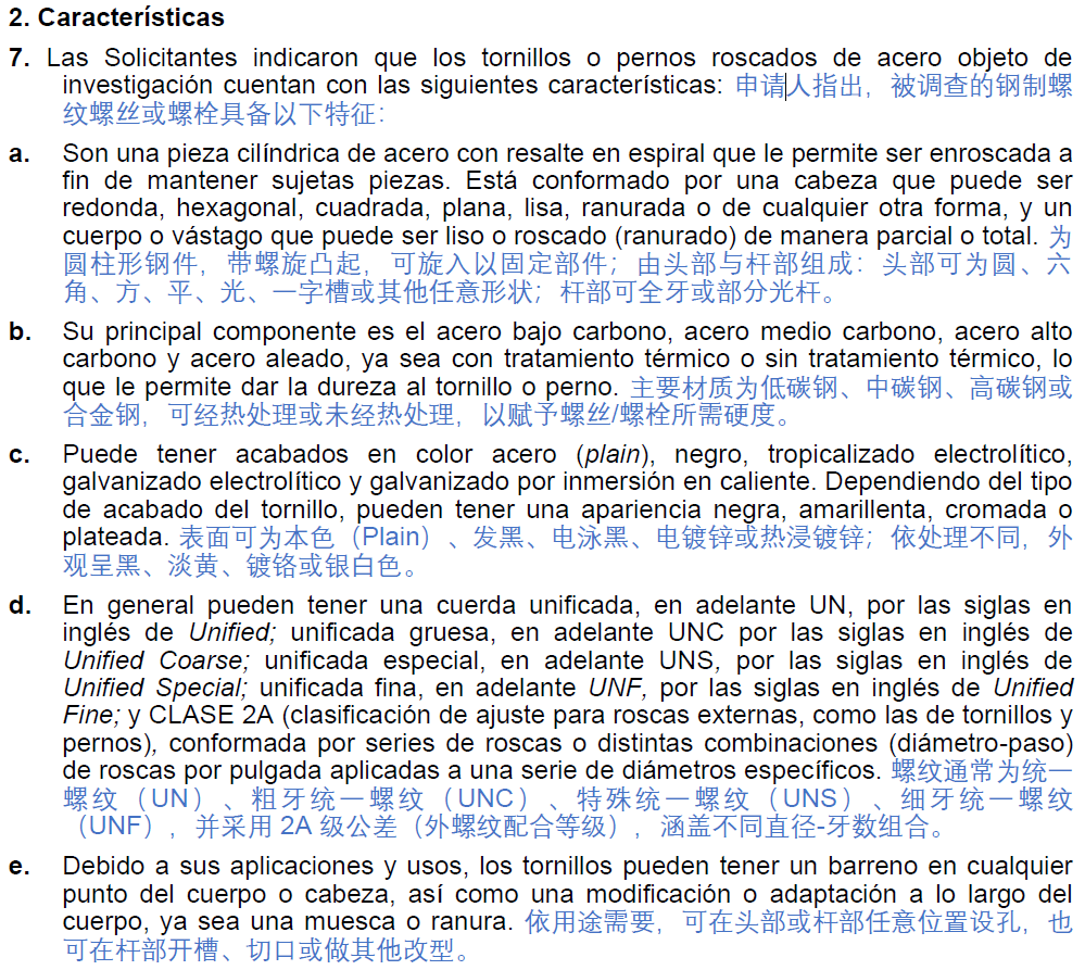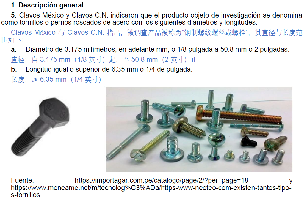 涉案产品的具体描述为直径为3.175 mm(1/8 英寸)至 50.8 mm(2 英寸),长度为6.35 mm(1/4 英寸)及以上的带有螺纹的钢制螺丝或钢制螺栓。本案涉及墨西哥海关编码7318.15.04和7318.15.99项下产品。